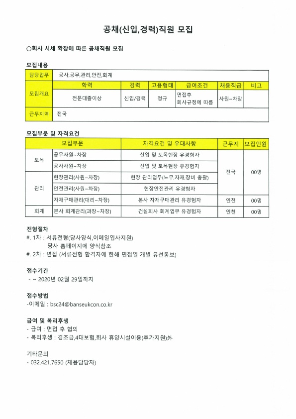 채용공고 2020년 반석건설(주) 신입,경력사원 모집 20-02-06 본문 2020년 반석건설(주) 신입,경력사원 모집 목록 이전글채용공고 (회계/세무관련 경력사원) 21.02.26