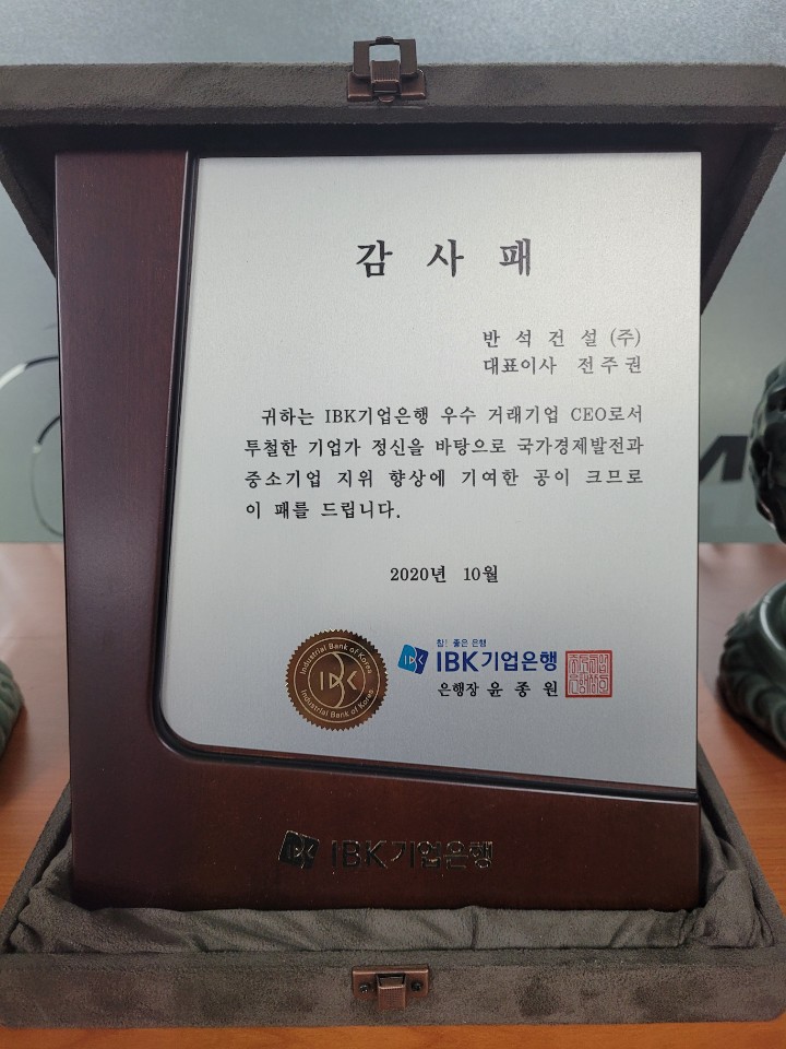 공지사항 IBK기업은행 우수 거래기업CEO 감사패 수상 20-11-30 본문 IBK기업은행으로 부터 우수 거래기업 CEO 감사패를 수상하였습니다. 목록 이전글수주공지(인천 무주골APT 토공 및 부대토목공사) 20.12.29 다음글수주공지(인천도시철도1호선 검단연장선 2공구 토공 및 구조물공사) 20.10.22